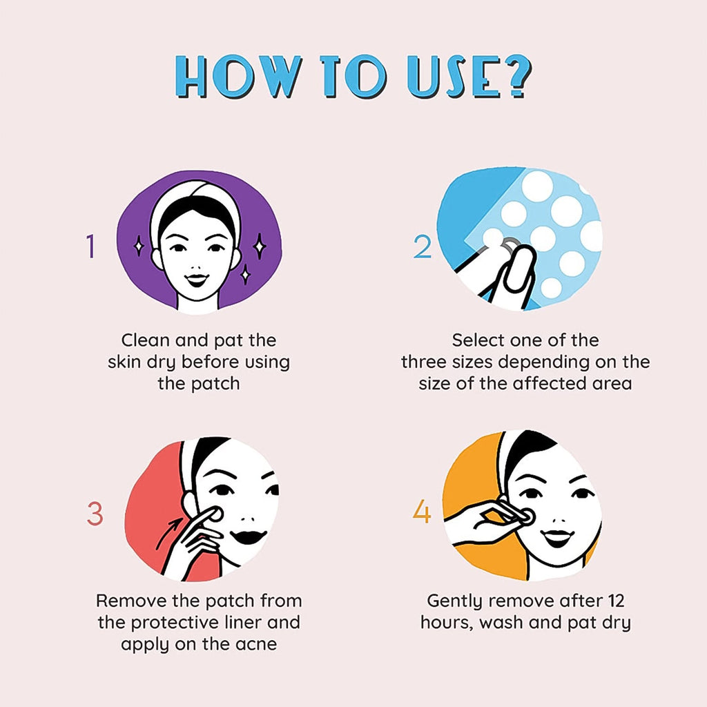 - Quick & Easy to Use - Using our acne patches is very easy. Simply clean and dry your pimple area, choose the right sized acne patch, carefully peel and stick the pimple patch on top of your pimple.